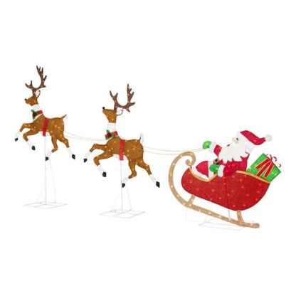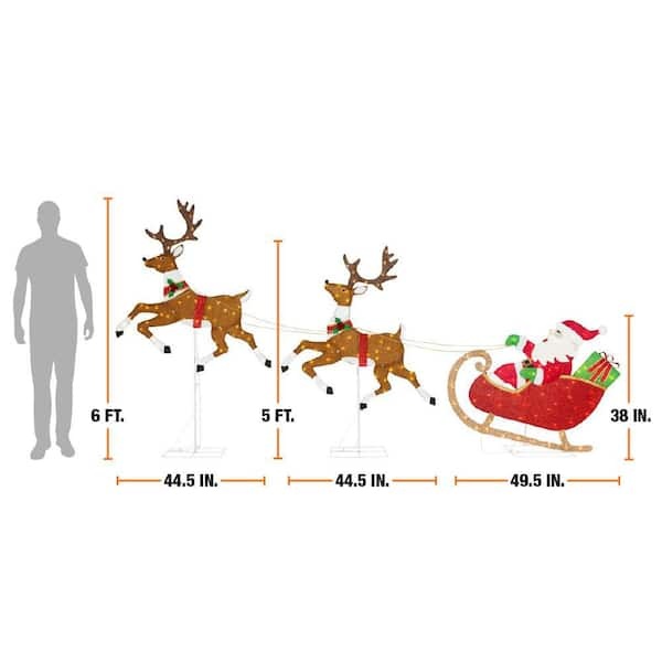 Create a festive Christmas display with this 6 ft. Yuletide Lane LED Santa's Sleigh with Reindeer from Home Accents Holiday. This reindeer is suitable for indoor or outdoor use. Reindeer leg lights alternate to simulate movement. Reindeer light functions include steady, slow, and medium movement. It has 198-warm white LED lights and durable pre-wired metal frame. It plugs into a standard outlet for flexible placement. Ground stakes, spare bulbs and fuses are included. It's the perfect yard decoration for your home, front porch, or yard. Pair with other Yuletide Lane holiday items.